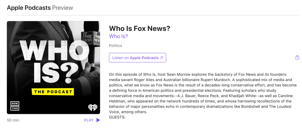 In 2021, I worked closely with Vice TV’s popular Dark Side of the 90s series on its sixth episode “Tabloid TV” about Rupert Murdoch’s role in tabloidizing American journalism. The episode was structured directly around the claims and timeline of my book’s first history chapter, and I appeared in the program itself as an expert commentator. This episode debuted on national television on July 12, 2022.